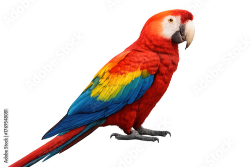 © PNG Kingdom , Fototapeta premium Scarlet macaw parrot displaying vibrant red, yellow, and blue feathers, standing profile, transparent background