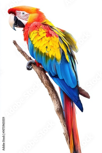 © Iram, Fototapeta premium Scarlet Macaw Parrot on Branch, Vibrant Tropical Bird on White Background