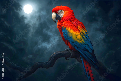 © Janananda, Obraz premium Scarlet Macaw Perched on Dark Branch in Moonlit Jungle Scene.