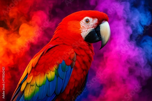 © Sergey, Obraz premium Scarlet macaw portrait against a vibrant, colorful, and artistic background