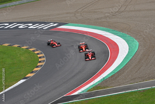 © Dan74, Obraz premium Scarperia; Italy - October 24th 2025: Ferrari SF90 and SF1000 ex Sebastian Vettel and Charles Leclerc in action during Ferrari World Finals 2025 at Mugello Circuit in Italy.