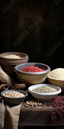 Fototapeta premium Scarves with various coloured grains and cereals such as rice, peas, lentils. AI generative.
