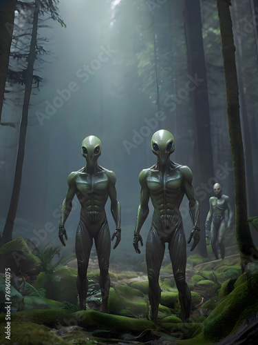 Fototapeta premium Scary Aliens Exploring A Forest On Planet Earth Cinematic Image Style