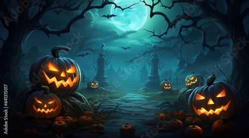Fototapeta premium Scary Atmosphere in a abandoned Cemetery decorated with Halloween Pumpkins. Cartoonized.
