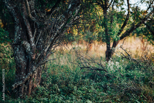 Obraz premium Scary, chaotic, garden with old lichen tree and dry branches on the ground
