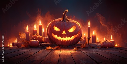 Fototapeta premium Scary Halloween Pumpkin on Wooden Planks Background