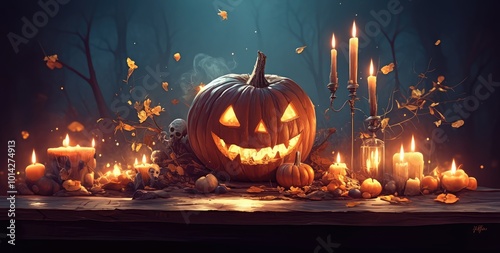 Fototapeta premium Scary Halloween Pumpkin on Wooden Planks Background