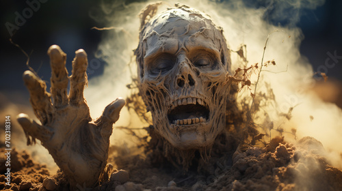 © Rizwan Ahmed Mangi, Obraz premium scary Halloween skull, Zombie hand emerging from the earth during the day