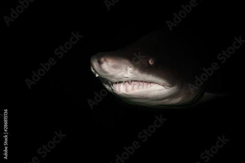 Naklejka premium Scary large shark swimming in the deep dark ocean.