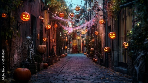 © Aisha, Fototapeta premium scary night in street with pumpkins