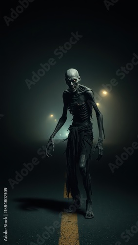 Naklejka premium Scary zombie monster walking on road in fog halloween horror night creepy undead creature