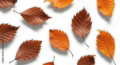 Fototapeta premium Scattered autumn leaves in shades of orange and brown cast gentle shadows on white.