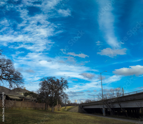 Obraz premium Scattered clouds in a deep blue sky over a suburban neighborhood