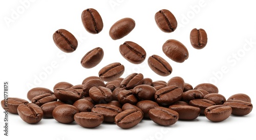 © Thecreator T, Naklejka premium Scattered Coffee Beans on White Background for Beverage Ads