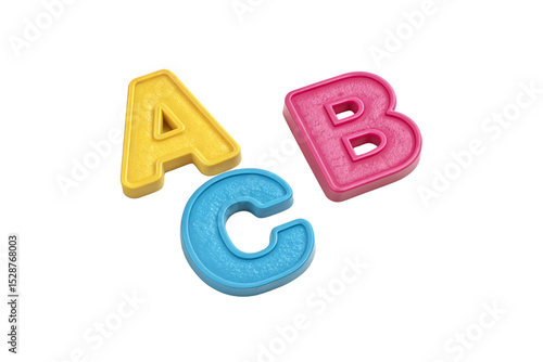 © Tanicsean, Naklejka premium Scattered colorful alphabet blocks A B C in yellow pink blue for early learning, isolated on a transparent background