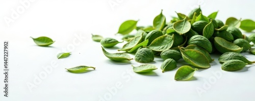 Naklejka premium Scattered dried green tea leaves on pristine white background , tea ceremony,...