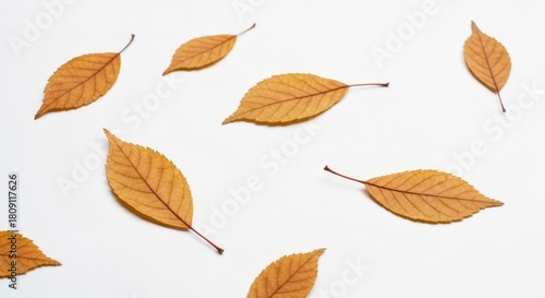 Fototapeta premium Scattered dried leaves with visible veins, warm orange and brown hues on white surface