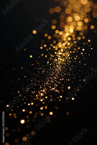 Fototapeta premium Scattered gold glitter, fine texture on black, backdrop, gold glitter