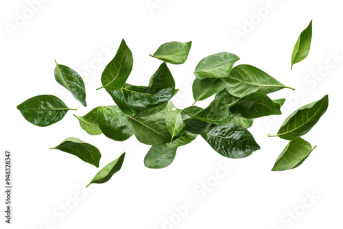 Fototapeta premium Scattered Green Leaves, Isolated green leaves on black background, Natural...