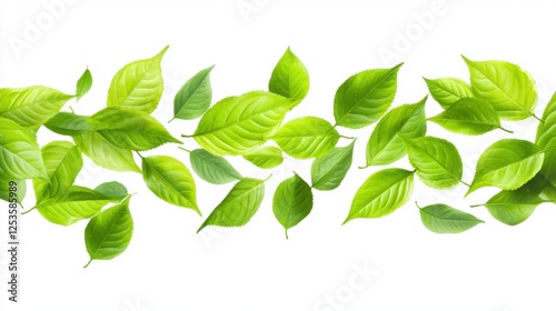 Fototapeta premium Scattered Green Leaves on a White Background Creating a Fresh and Lively...