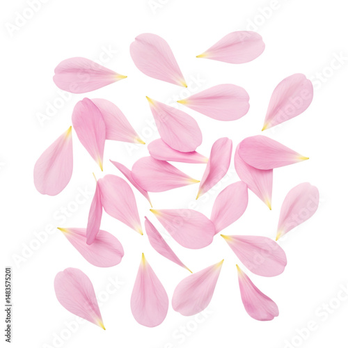 © Nilufa, Naklejka premium Scattered pink flower petals isolated on a transparent background creating a floral pattern