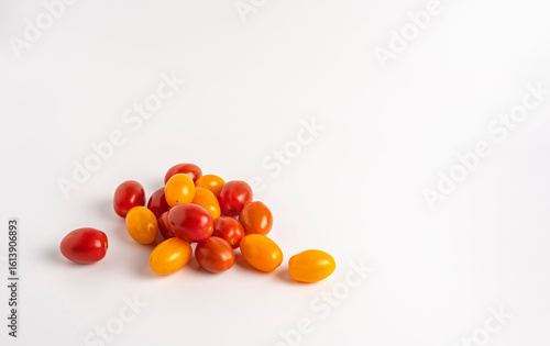 © Gennadi, Obraz premium Scattered red and yellow cherry tomatoes on white background, fresh and colorful.