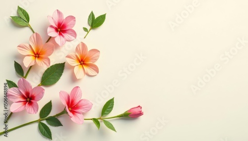 © box, Fototapeta premium Scattered single blooms, light green leaves on cream, plant, background, single flower