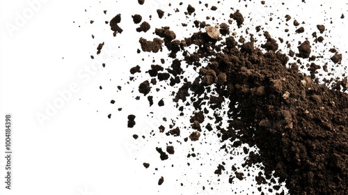 Fototapeta premium Scattered soil dirt flying in the air, isolated on a white background, with dynamic particles suspended mid-flight.