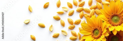 Fototapeta premium Scattered sunflower seeds, pristine white backdrop, grain, food photography, image