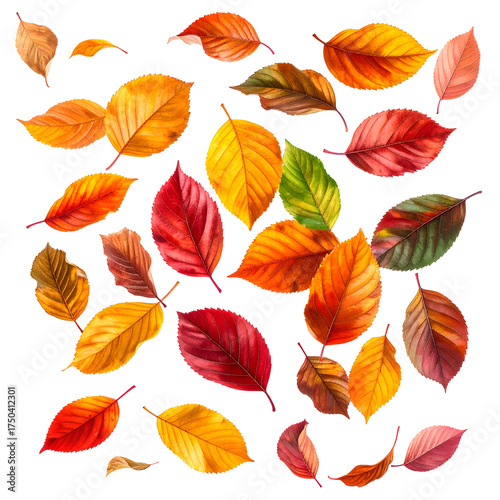 Obraz premium Scattered, vibrant autumn leaves in varying hues of red, orange, and yellow...