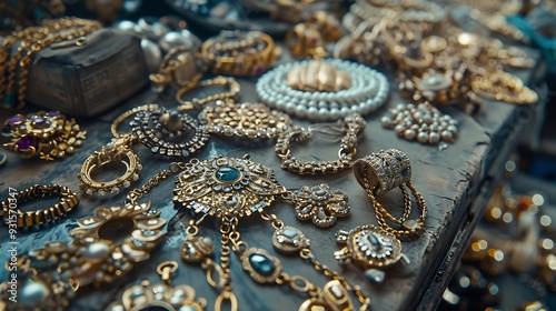 Fototapeta premium Scattering of different jewelry on a flea market counter : Generative AI