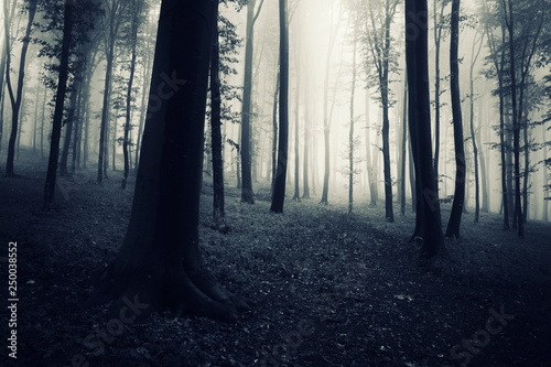 Obraz premium scena z ciemnymi lasami, drzewa we mgle i tajemnicza ścieżka prowadząca do...