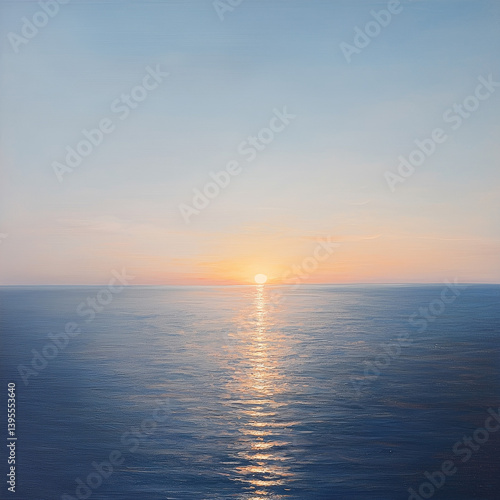 Naklejka premium scene captures a peaceful sunrise as first rays of light emerge over horizon illuminating calm sea and symbolizing start of a fresh day