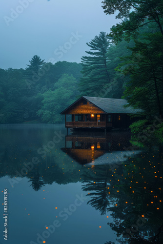 Fototapeta premium Scene of a quiet lakeside cabin, the peaceful summer setting reflected in...