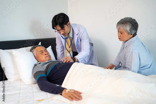 Fototapeta premium scene of doctor checking bedridden patient symptom. illness senior suffer...