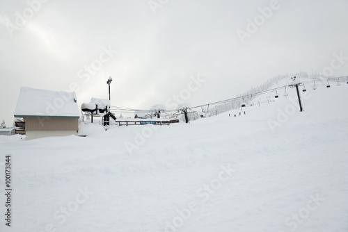 © checubus, Obraz premium scene of ski lift with seats over the mountain and paths from skier.