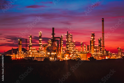 © chitsanupong, Fototapeta premium Scene of the oil refinery plant of petrochemistry Oil​ refinery​ and​ plant and flue smoke industry in oil​ and​ gas​ ​industry with​ cloud​ red and orange ​sky the morning​