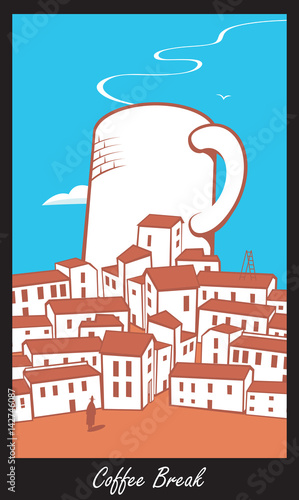 Fototapeta premium Scene with a big cup of coffee in town with inscriptions Coffee break in...