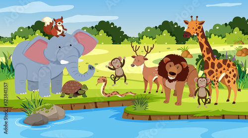 © brgfx, Fototapeta premium Scene with many animals standing by the river