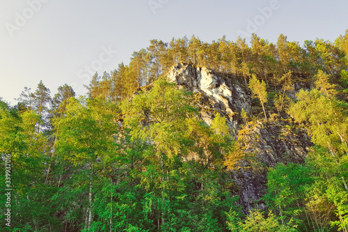 © Anna Shnaider, Fototapeta premium Scenery landscape with green forest and high rocky mountain under blue sky. summer