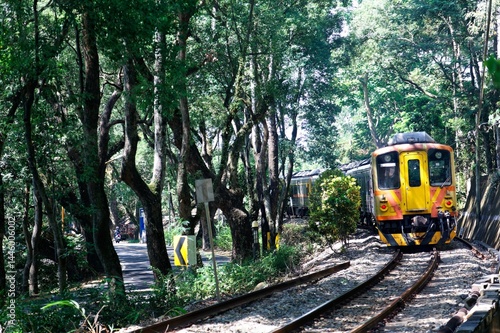 © AaronPlayStation, Naklejka premium Scenery of a local train traveling through a curve on Jiji Railway Line under an archway of old giant camphor trees with the morning sunlight shining through the lush greenery, in Nantou, Taiwan, Asia