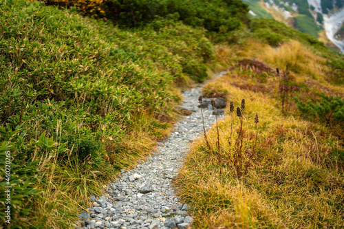 © Masakazu Tokashiki, Fototapeta premium 富山県立山町の立山の秋の紅葉の季節に登山している風景 Scenery of climbing Tateyama Mountain in Tateyama Town, Toyama Prefecture, Japan during the season of autumn leaves.