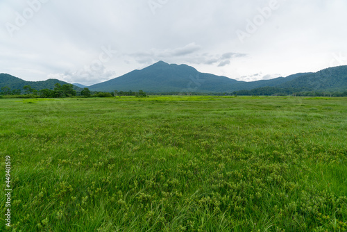 Fototapeta premium 福島県、新潟県、群馬県にある尾瀬ヶ原をハイキングしている風景 Scenery of hiking in Ose-ga-hara in Fukushima, Niigata and Gunma prefectures.
