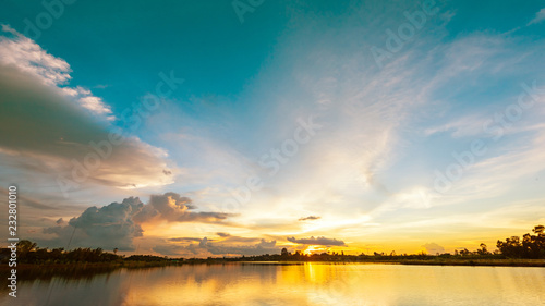 © peangdao, Fototapeta premium Scenery sunset over calm lake landscape panorama