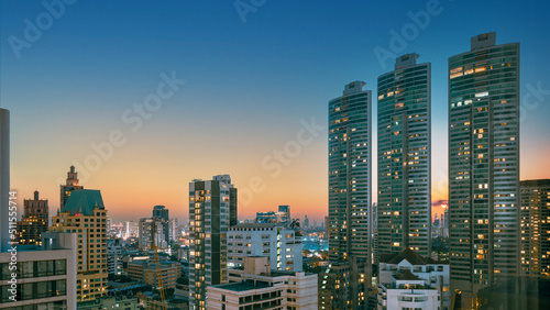 Obraz premium Scenery view night cityscape at sunset with skyscraper in Bangkok, Thailand.