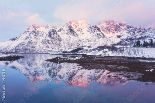 Obraz premium Scenery winter landscape in the Norway. Mountain ridge with reflection in the lake in gentle sunset light, Laupstad, Lofoten Islands