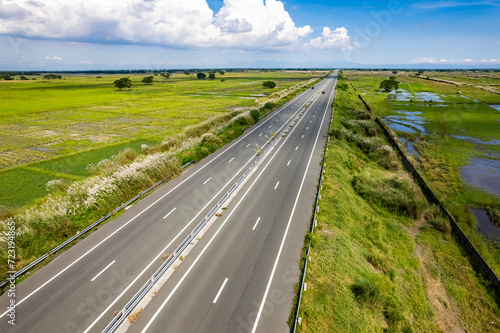 © Mdv Edwards, Fototapeta premium Scenic aerial shot of an empty highway cutting through lush green fields under a clear blue sky, emanating tranquility and ease. At Central Luzon Link Expressway.