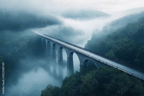 © indika, Fototapeta premium Scenic Aerial View of a Foggy Railroad Bridge Crossing a Serene River in a Mist-Covered Mountainous Landscape