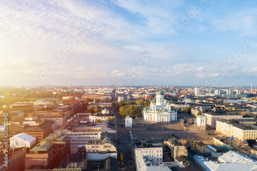 Obraz premium Scenic aerial view of Helsinki Cathedral in the capital of Finland at sunset. Beautiful sky and clouds.