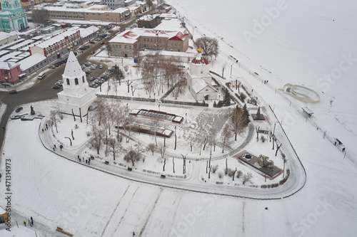 © Petr Zyuzin, Obraz premium Scenic aerial view of ruins of ancient Kremlin in historical center of old russian town Syzran in Samara region in Russian Federation. Beautiful winter look of old ruined fortress in town in Russia